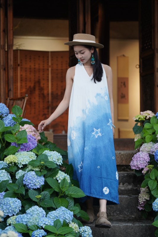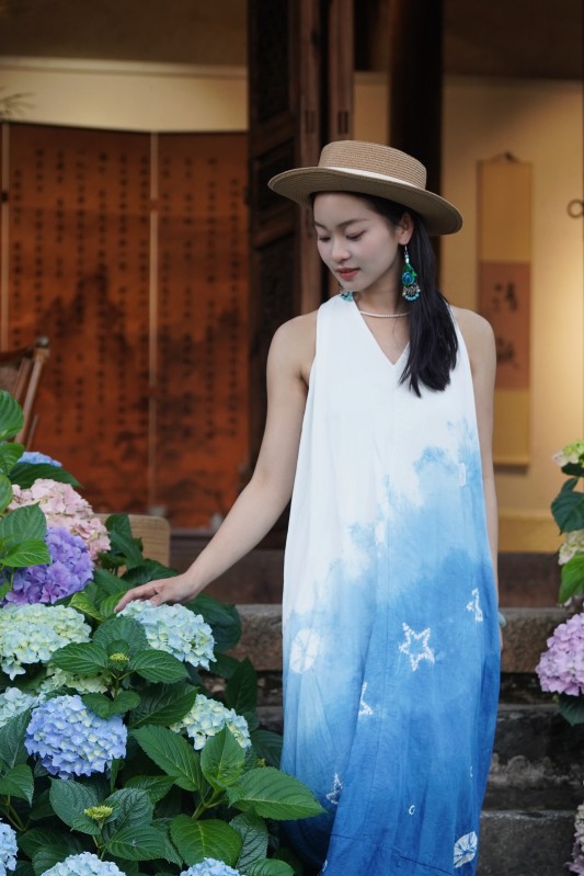 2025新款扎染体验款V领后背纽带毛边连衣裙