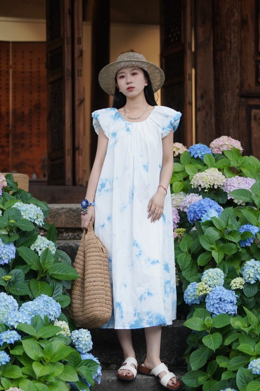 2025新款扎染体验款泡泡袖半袖连衣裙蓝天白云款