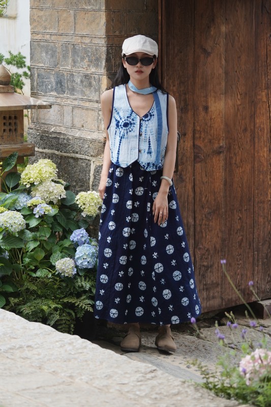 2025新款两件套扎染精品珠纹马褂上衣+扎染珠花小蝴蝶半身裙