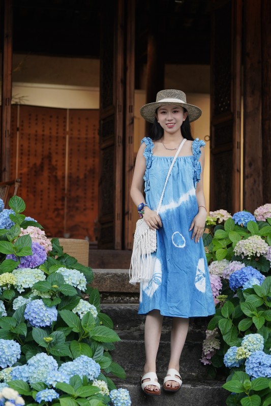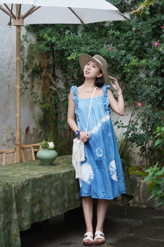 2025新款扎染体验款木耳边肩带款连衣裙蓝色渐变款